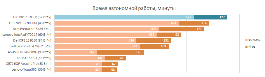 С выходом каждой новой линейки ультранизковольных процессоров Intel время работы ноутбуков от одного заряда аккумулятора приятно увеличивается. Dell XPS 13 9350 оказался самым долгоиграющим среди лэптопов, которые прошли через наши руки за последние пару месяцев. Просмотр фильмов в HD-качестве, с включённым Wi-Fi и 53% яркости экрана без подзарядки длился почти девять часов. При полной яркости — примерно семь с половиной часов. Поиграть столько же, конечно, не удастся, лэптоп попросит подключить его к сети через два часа, что тоже неплохой результат.