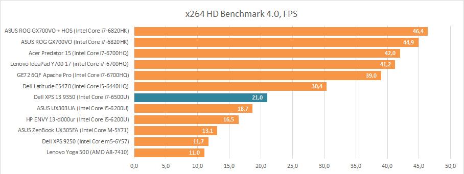 Под «капотом» Dell XPS 13 9350 встречается один из трёх современных низковольтных процессоров, разработанных специально для компактных лэптопов — Intel Core i5-6200U, Intel Core i7-6500U или Intel i7-6560U. Первый уже неоднократно встречался нам в тестах, теперь пришло время посмотреть, насколько «быстрее» его старший брат, Intel Core i7-6500U, которым оснащена наша конфигурация. По результатам процессорных тестов разница составляет от 12 о 23%, что, с одной стороны существенно, но, с другой, вряд ли будет бросаться в глаза. Если для вас действительно важна производительность, например, скорость кодирования видеороликов, то стоит брать совсем другой лэптоп. А если вы готовы немного подождать или вообще не планируете загружать ноутбук на все сто процентов, то можете спокойно брать Dell XPS 13 9350 хоть с Intel Core i7-6500U, хоть с Intel Core i5-6200U. А вот Intel i7-6560U имеет более производительное графическое ядро, но на тестах у нас еще не было, и заочно обсуждать его потенциал в играх мы не будем.