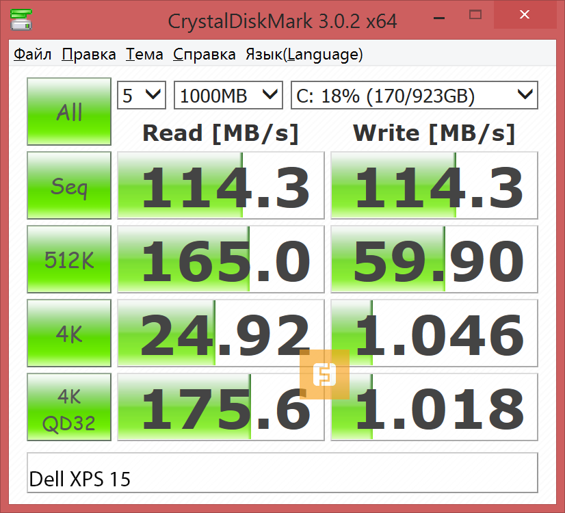 Western Digital нечасто балует нас своим присутствием в серийных моделях ноутбуков, но представленный в Dell XPS 15 WDC Blue показал отличные результаты в тесте CrystalDiskMark. А небольшой SSD помог жёсткому диску там, где необходимо быстро считывать маленькие файлы.