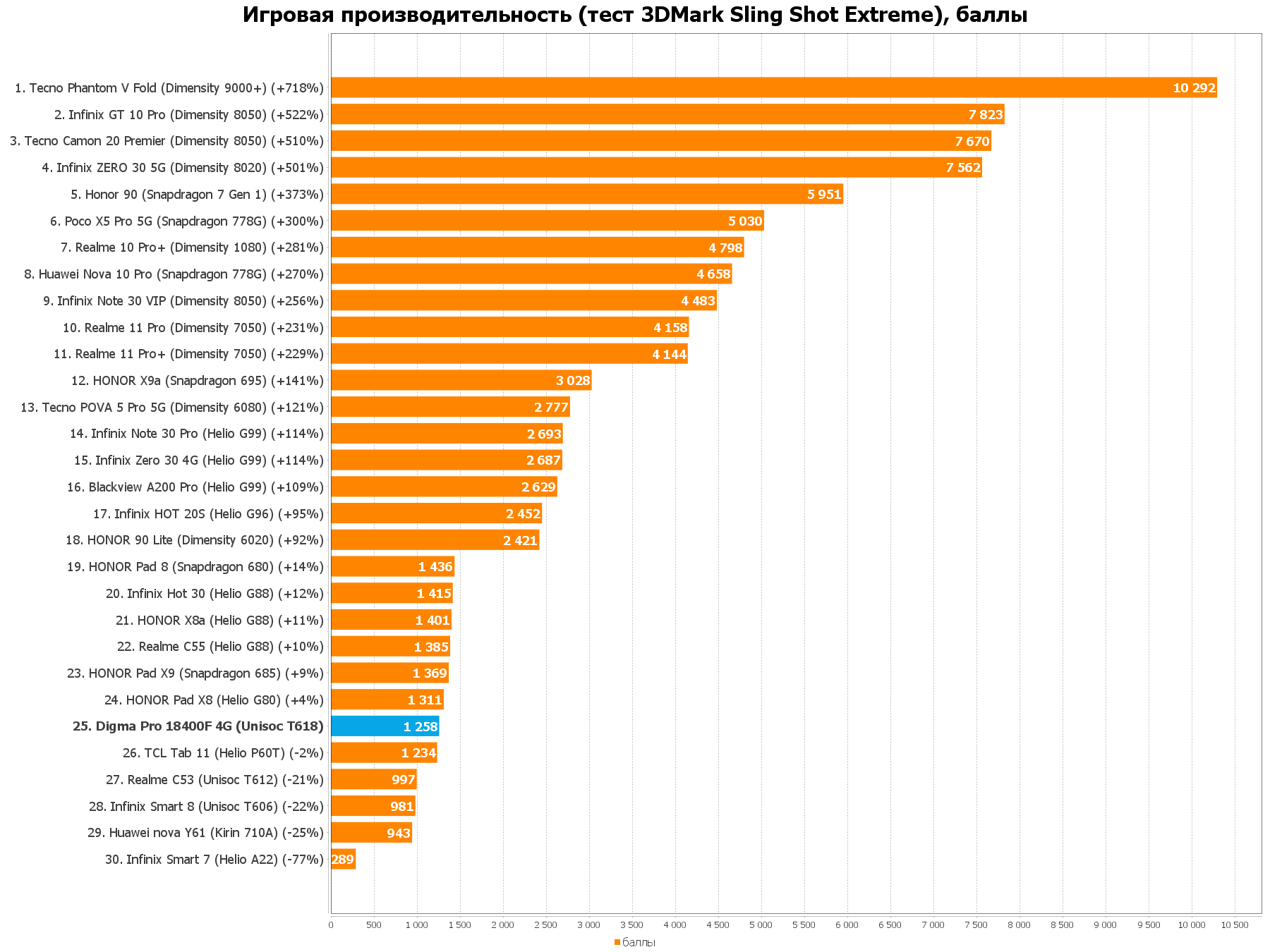 За производительность в планшете отвечает уже хорошо известный по бюджетным смартфонам чип Unisoc Tiger T618, изготовленный по техпроцессу 12 нанометров и «вмещающий» в себя 8 ядер (2х2.0 ГГц Cortex-A75, 4х1.8 ГГц Cortex-A55) и графику Mali-G52. В нашем «общем зачёте» (напомню, что мы сравниваем девайс со всеми ранее обозреваемыми устройствами) Digma Pro 18400F плетётся где-то ближе к концу, что и не удивительно, ведь в смартфонах его устанавливают в модели в ценовой категории от 8 до 12 тысяч рублей.