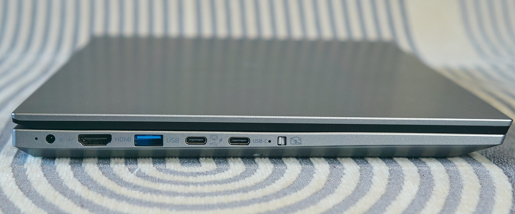 При этом в ноутбуке есть разъёмы на все случаи жизни. На левом боку расположены: цилиндрический разъём питания, полноразмерный HDMI версии 1.4, USB-A стандарта USB 3.0, USB-C стандарта USB 3.0 с возможностью зарядки и видеовыхода, USB-C стандарта USB 2.0. Справа — переключатель, физически отключающий камеру и микрофон. Если его поставить в положение «выкл», камера перестаёт даже определяться в диспетчере задач, а вот микрофон просто глушится.