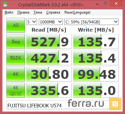 Говорить о различиях в процессорах и видеоускорителях нам сегодня не приходится — ноутбуки оборудованы идентичными системами-на-чипе и абсолютно одинаково работают с оперативной памятью. Тем не менее, результаты LIFEBOOK U574 демонстрируют, что инженеры FUJITSU пошли на некоторые компромиссы в производительности относительно референсных образцов Core i5-4200U. Это не идёт герою нашего теста в плюс, поскольку 25-процентное отставание на ровном месте для ультранизковольтных процессоров станет заметным ограничением.