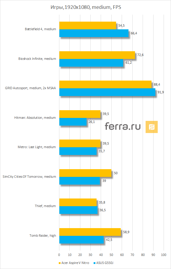 Игры, как ожидалось, почти повторили результат, показанный 3DMark’ом. На средних настройках Acer Aspire V Nitro опережал оппонента в среднем на 15%, на очень высоких настройках — на 29%. Максимум этого лэптопа — средние-высокие настройки в Full HD разрешении, но не максимальные, в них средний FPS находится ниже комфортного уровня. Однако всё зависит от конкретной игры — вы сами можете видеть это на графиках. Максимальная разница с ноутбуком на видеокарте 850M составила 16 кадров в секунду, минимальная же была иногда даже отрицательной, а средняя — 5-6 FPS. Скорее всего, в ноутбуке, не ограниченном тонким корпусом, результат был бы выше. Чтобы удостовериться в этом, необходимо было провести стресс-тестирование.