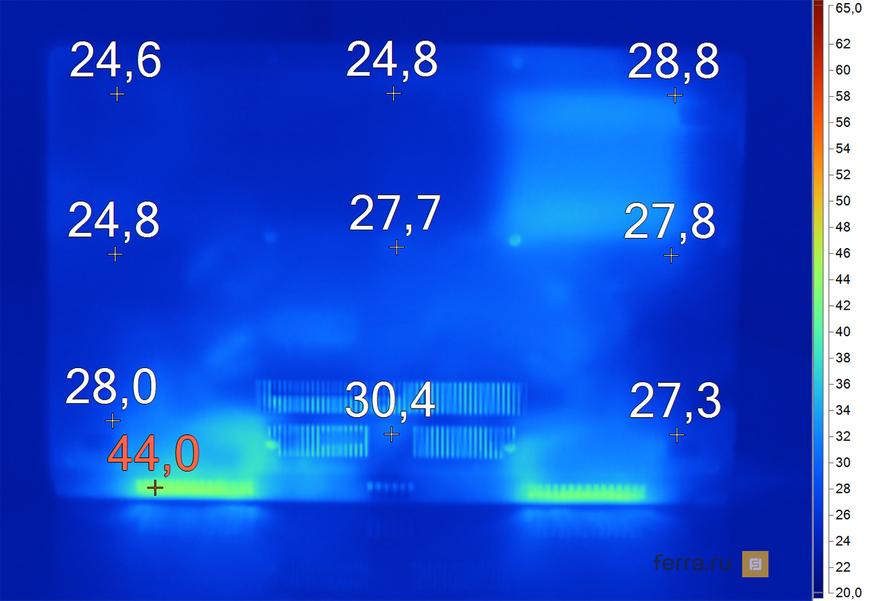 Что ещё может принести дискомфорт геймеру, кроме нестабильного FPS? Лишний шум и горячий корпус. Acer Aspire V Nitro работает заметно тише, чем можно от него ожидать, к тому же система охлаждения повышает обороты двух своих вентиляторов в самый последний момент, дабы лишний раз не раздражать пользователя. Температура корпуса, пока ноутбук простаивает, низкая, а когда дело доходит до игр, то греется в основном центральная часть клавиатуры. Но клавиши WASD лишь немного выше температуры поверхности кожи человека. Наибольший дискомфорт можно себе причинить только, прислонив к коленям решётку вентиляции ноутбука. Во-первых, так делать не надо, поскольку так вы «задушите» лэптоп, во-вторых, она способна нагреться аж до 63 градусов. Поэтому, играя в игры, Acer Aspire V Nitro лучше всего ставить не на колени, а на ровную поверхность, а лучше на специальную вентиляционную подставку для ноутбуков.
