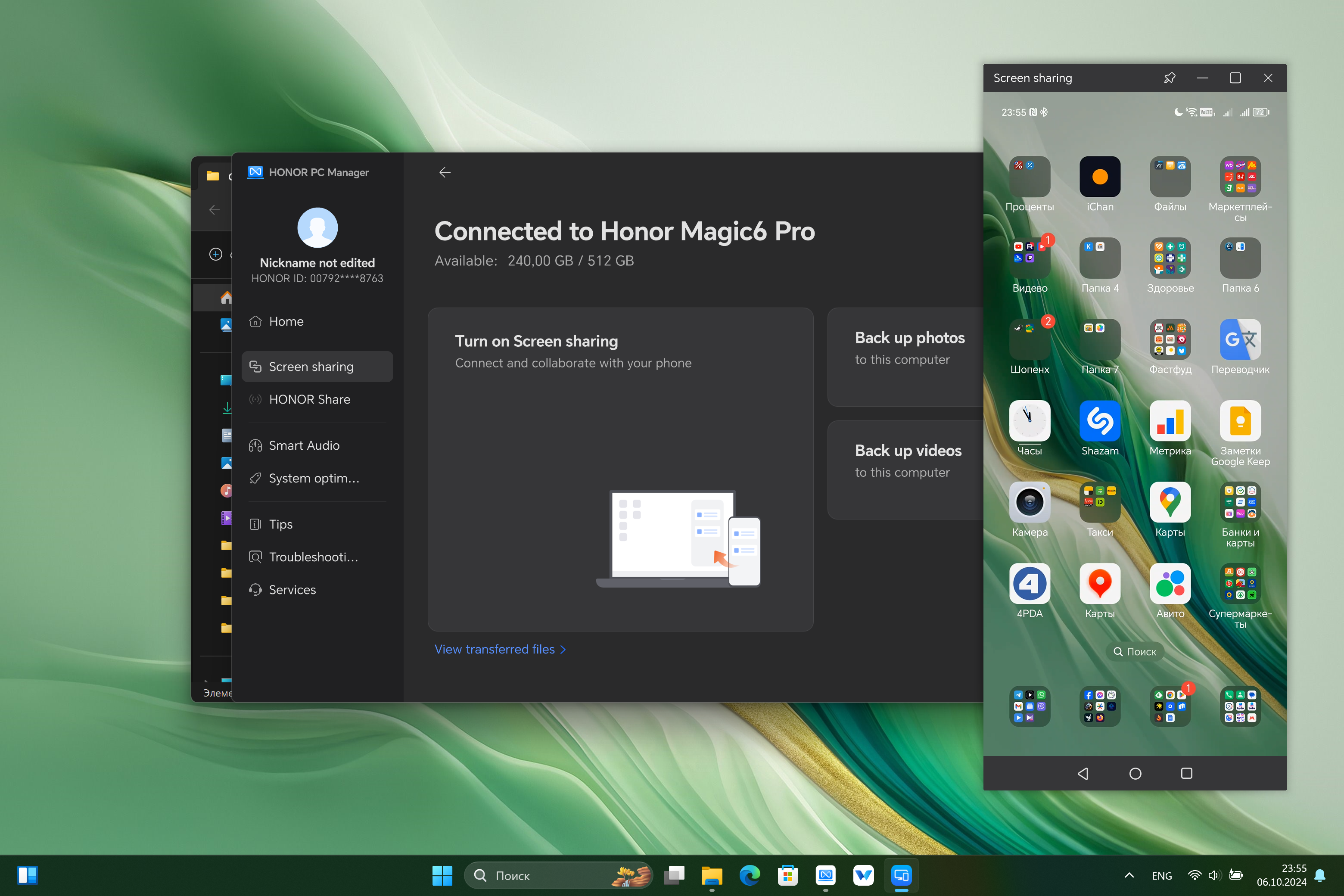 - Дисплей при этом ещё и сенсорный. Вы можете подключить трансляцию дисплея со смартфона HONOR и управлять Андроидом касанием к сенсорному дисплею ноутбука (с тачпада имитировать сенсорное управление гораздо сложнее).