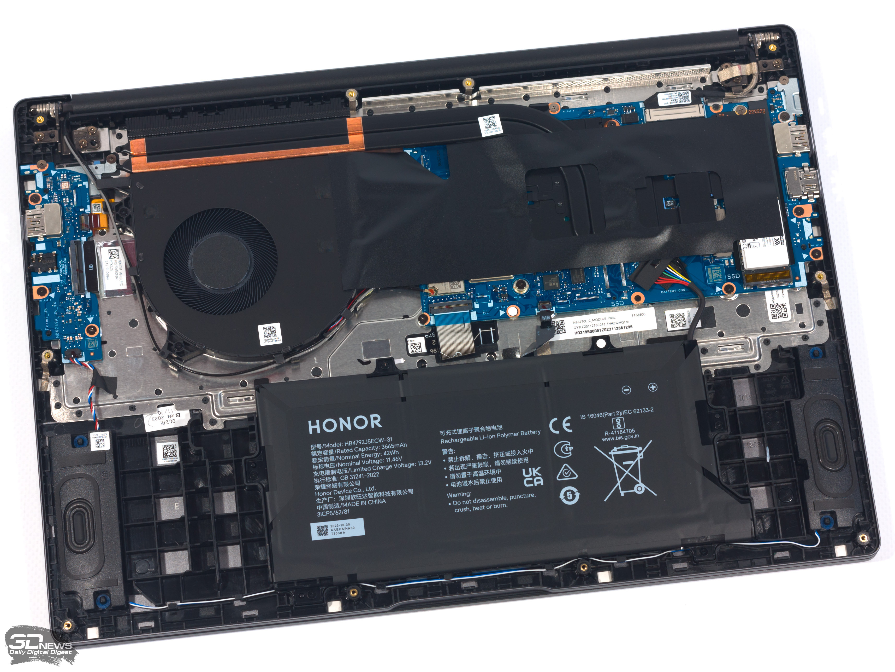 Как обычно, HONOR отличаются не характеристиками (можно взять менее известный «китайбук» на 20+ тысяч дешевле), а качеством исполнения — если оперативная память (а она же и видеопамять для встроенной графики), то качественная. Если SSD — то не PCIe 3.0 «на сдачу», а нормальная по быстродействию модель. Дисплеи IPS, но без низкочастотного ШИМ (мерцания). И ёмкость аккумулятора в пользу красивого малого веса «в таблице» тоже никто не стал ронять, хотя и могли бы при желании.