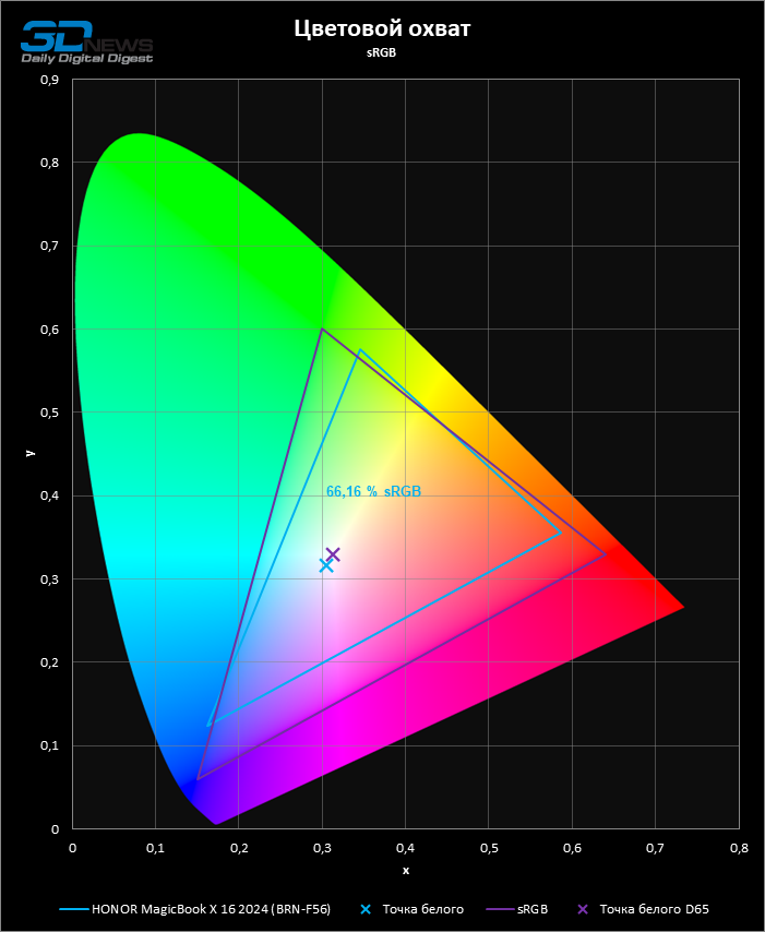 - Дисплей в MagicBook X16 — всего лишь «нормальный»: в порядке по яркости и контрастности. Не будет обломно пользоваться и таким (у Tecno дисплей хуже, например), но если хотите цветопередачу «как у MacBook», раскошеливайтесь на MagicBook X16 Pro.