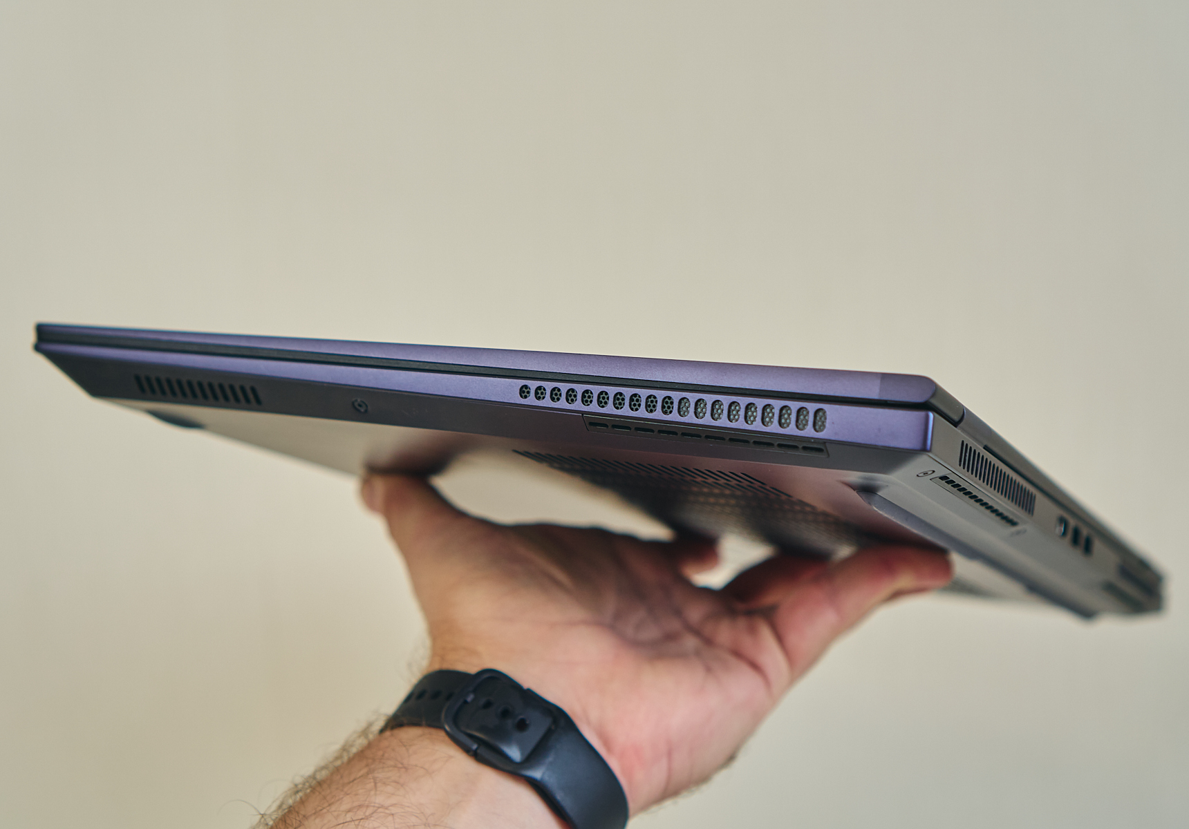 Первое — странный набор и расположение портов. Сначала я вообще подумал, что здесь всего два разъёма USB-C (один из них — Thunderbolt 4, второй — USB 3.2, но каждый из разъёмов может быть использован для подключения питания), но потом нашёл ещё два USB-A (USB 3.2) и полноразмерный HDMI на… Заднем торце.