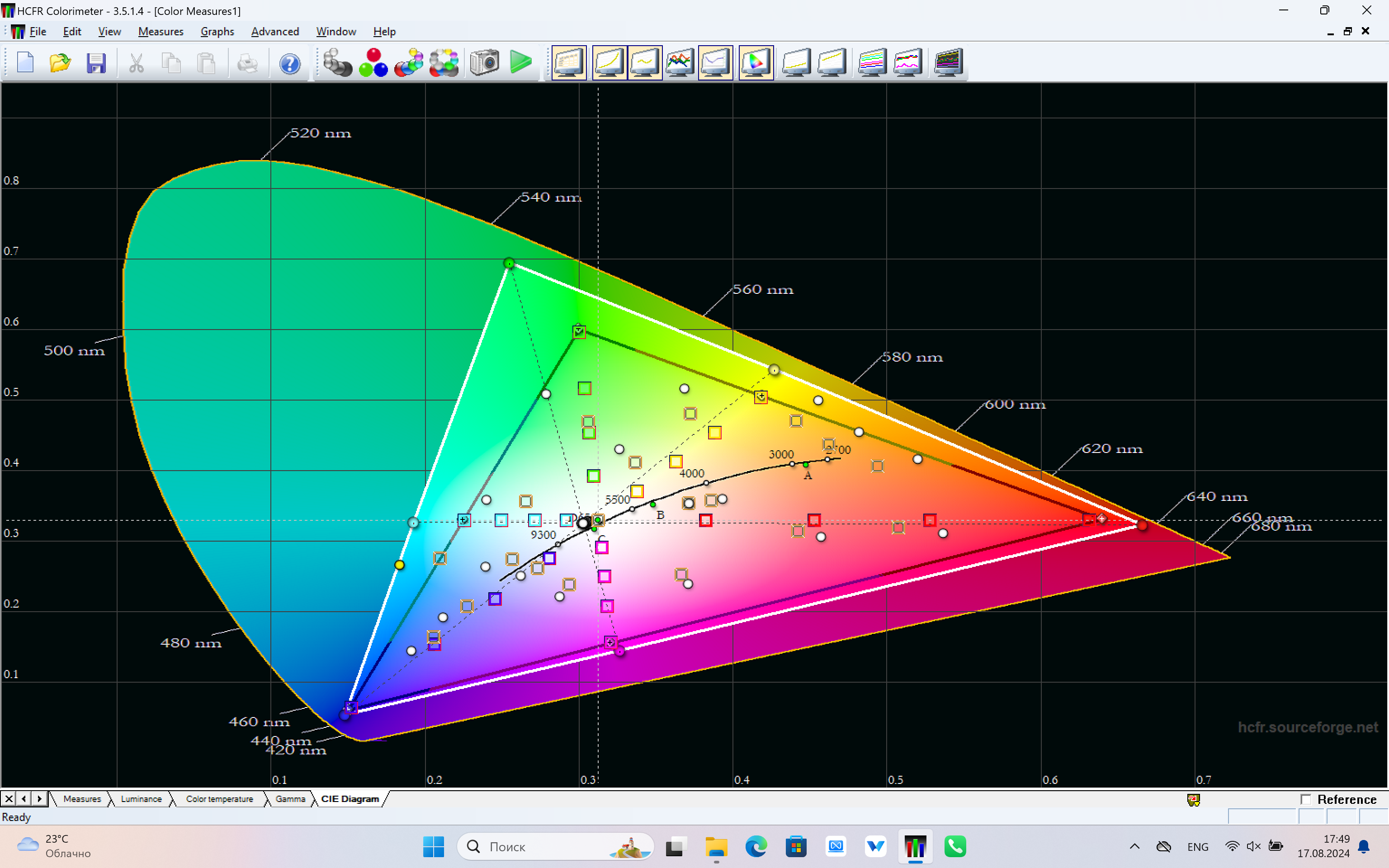 Разрешение экрана 3072×1920 пикселей — это соответствует соотношению сторон 14,4:9 ну или 16:9,9. Максимальная частота обновления экрана — 165 Гц, также можно выбрать 120 Гц и 60 Гц. Измеренная редакционным колориметром максимальная яркость достигала значения 451 кд/м2, хотя в другом софте для измерений можно намерить и свыше 500 кд/м2. К слову, дисплей поддерживает и HDR. Тип матрицы — IPS, модель — TL160MDMP01.