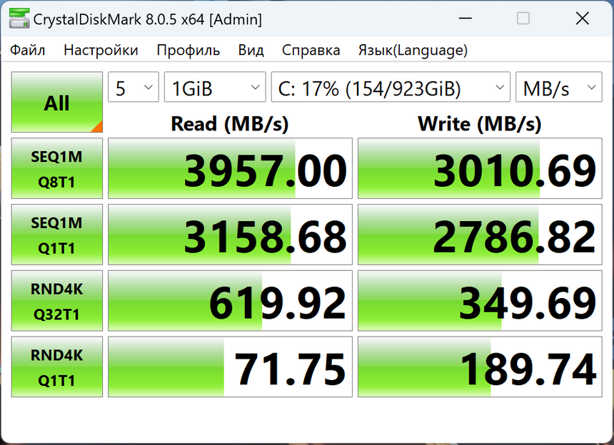 SSD тут довольно шустрый, но не топовый. В ноутбуке стоит накопитель YMTC PC300-1TB-B объёмом 1 Тбайт (видимый Windows объём — 953,9 Гбайт), подключается через шину PCIe 4.0 по интерфейсу NVMe 1.4. Скорость чтения составляет до 3957 Мбайт/с, записи — до 3010 Мбайт/с. Бывают и быстрее на PCIe 4.0, но и этого хватает за глаза.