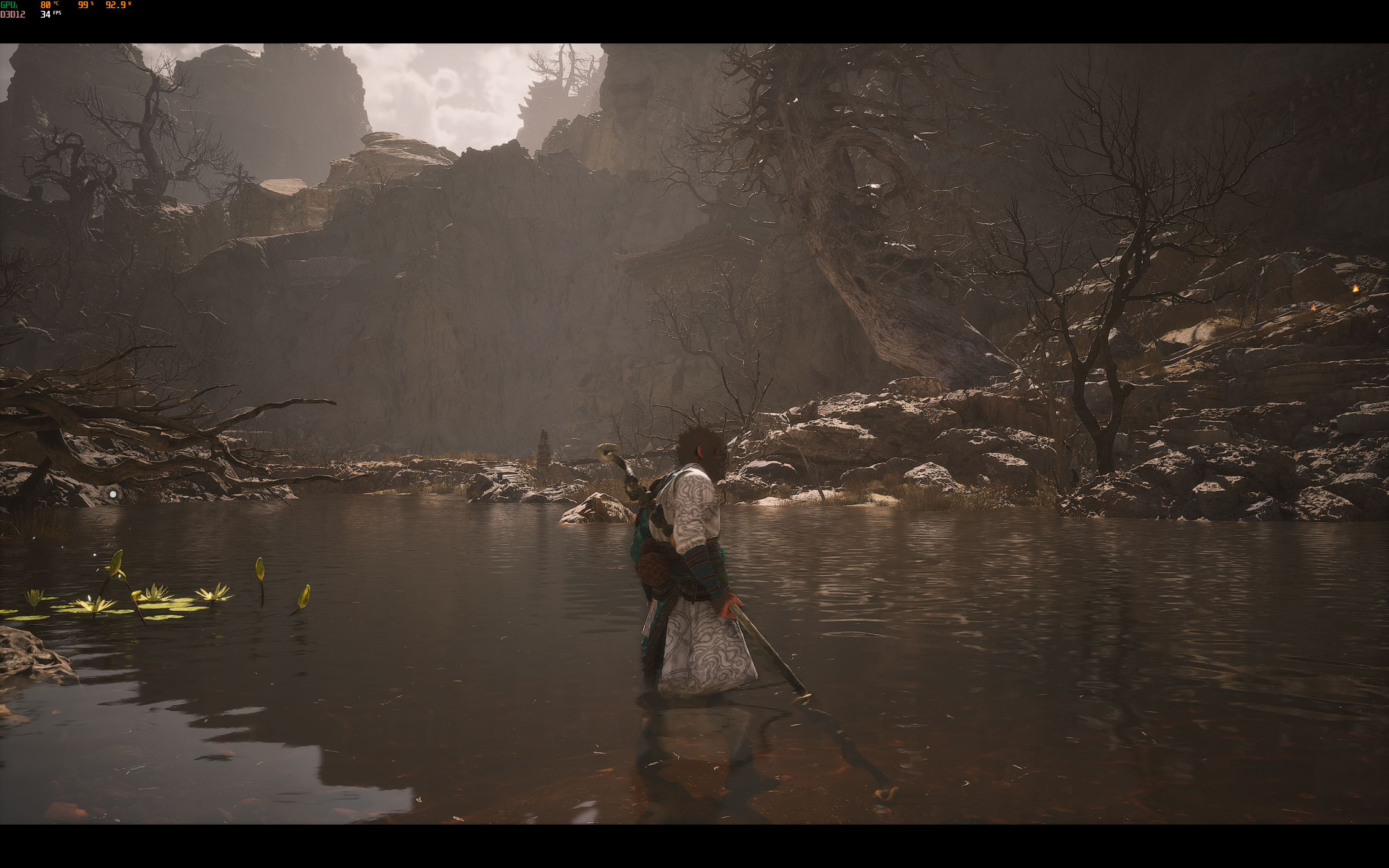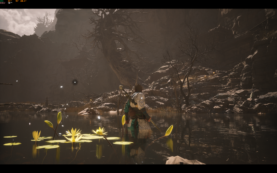 Я опробовал The Elder Scrolls IV: Oblivion Remastered, Roadcraft, Monster Hunter Wilds и Blackmyth: Wukong, но уже в нативном для ноутбука разрешении 3072x1920. Последняя особенно интересна для теста поскольку предлагает гибкие настройки и при этом на максимальных настройках действительно выглядит круто и реалистично, в отличие от Monster Hunter Wilds, которая даже на моём десктопном ПК смотрится отвратительно и хуже Monster Hunter World прошлого поколения. Более того, я так и не смог не понижая серьёзно настройки добиться стабильных 60 FPS в MH Wilds, но то же можно сказать и про мой десктоп (Ryzen 7 7700 + RTX 4070 Ti Super). Уж очень плохая у этой игры оптимизация.
