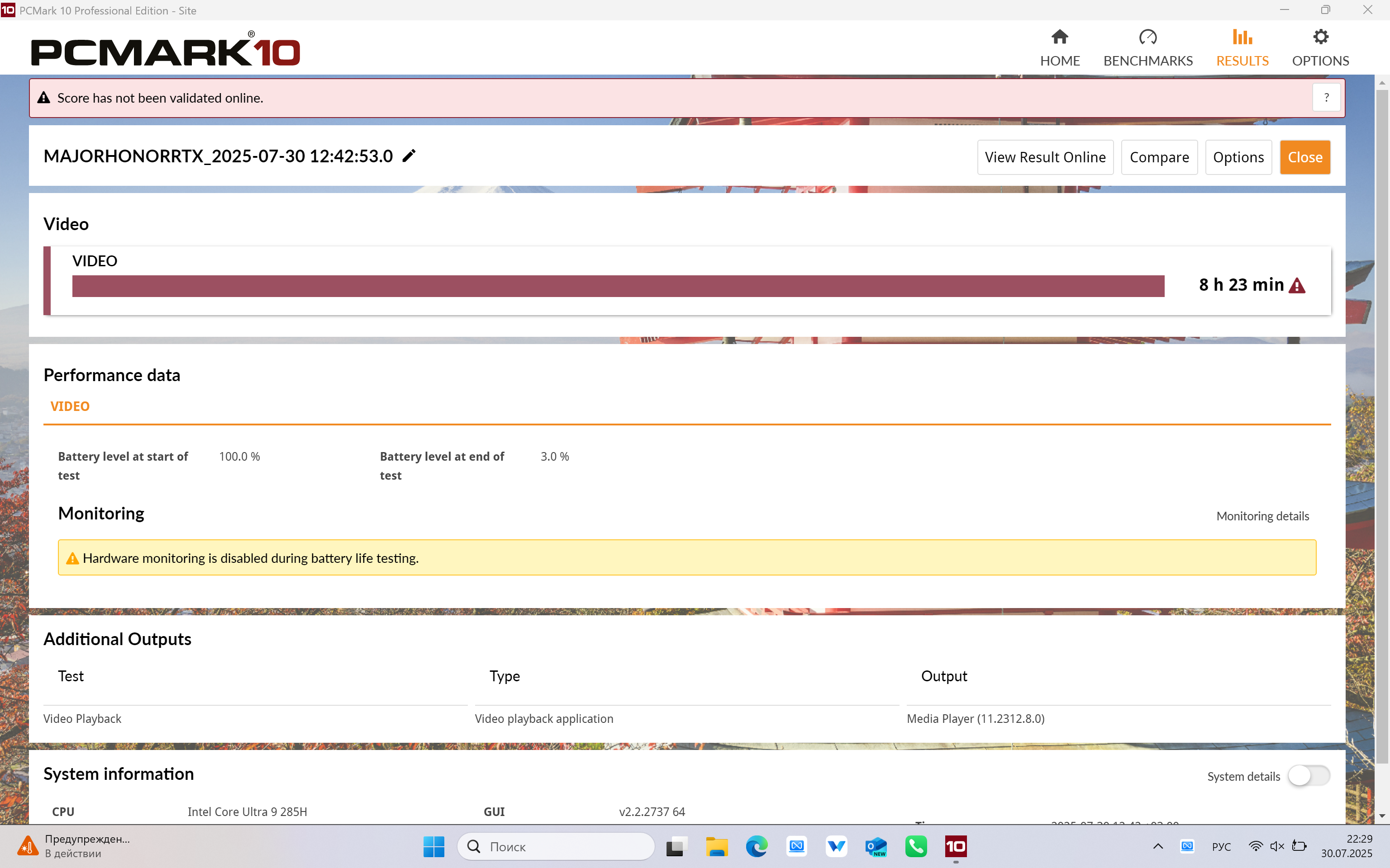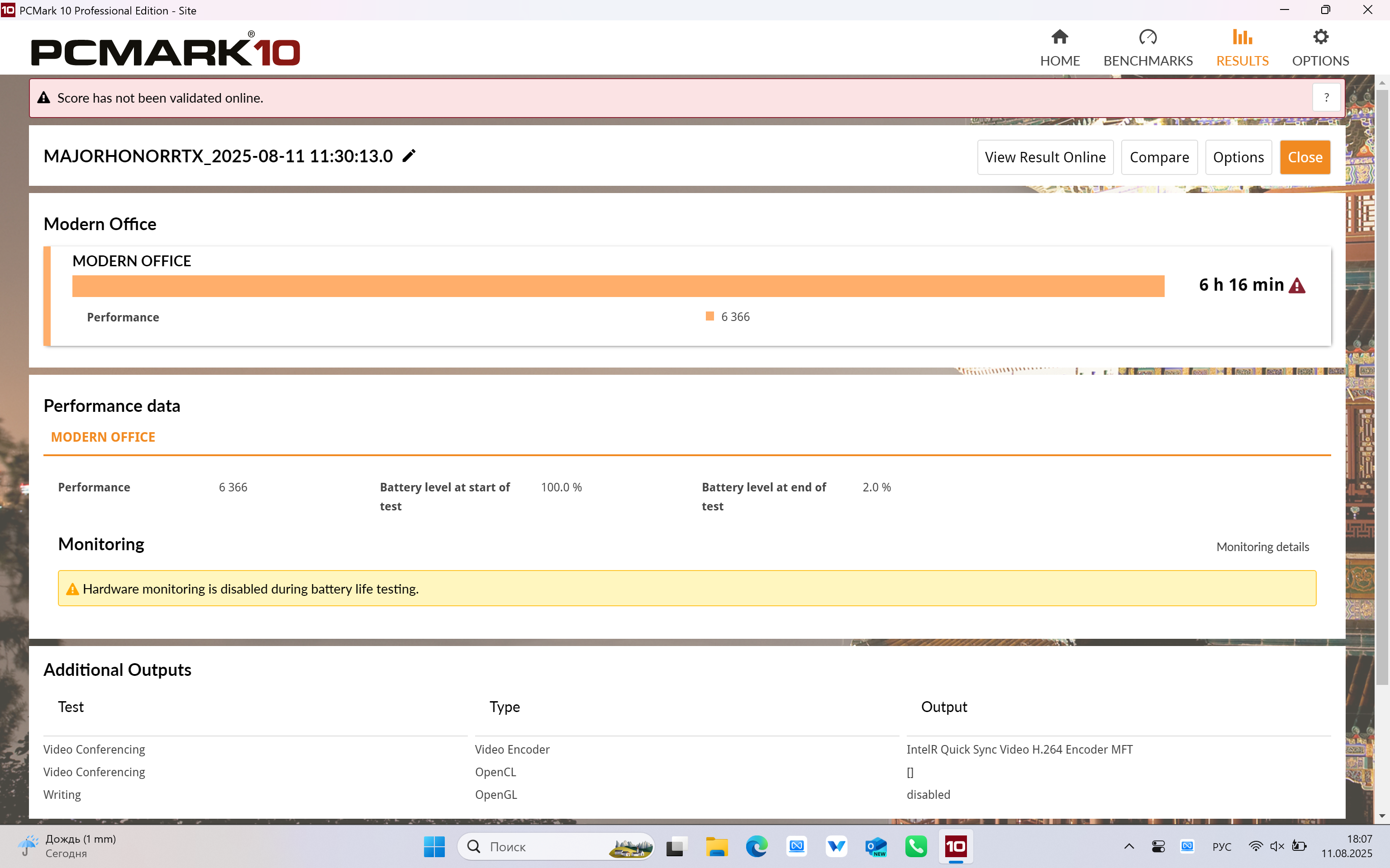 В HONOR MagicBook Pro 16 HUNTER используется батарея 75 Вт⋅ч. Для тестирования автономности ноутбука я выставил яркость экрана на 200 кд/м2 (более чем достаточно при работе в помещении даже если вы сидите возле окна), включил максимальную частоту обновления экрана — 165 Гц, установил умный режим производительности и оставил включёнными две видеокарты (спойлер: в тесте, разумеется, была задействована только встроенная видеокарта — так решила автоматика, но я должен был проверить).
