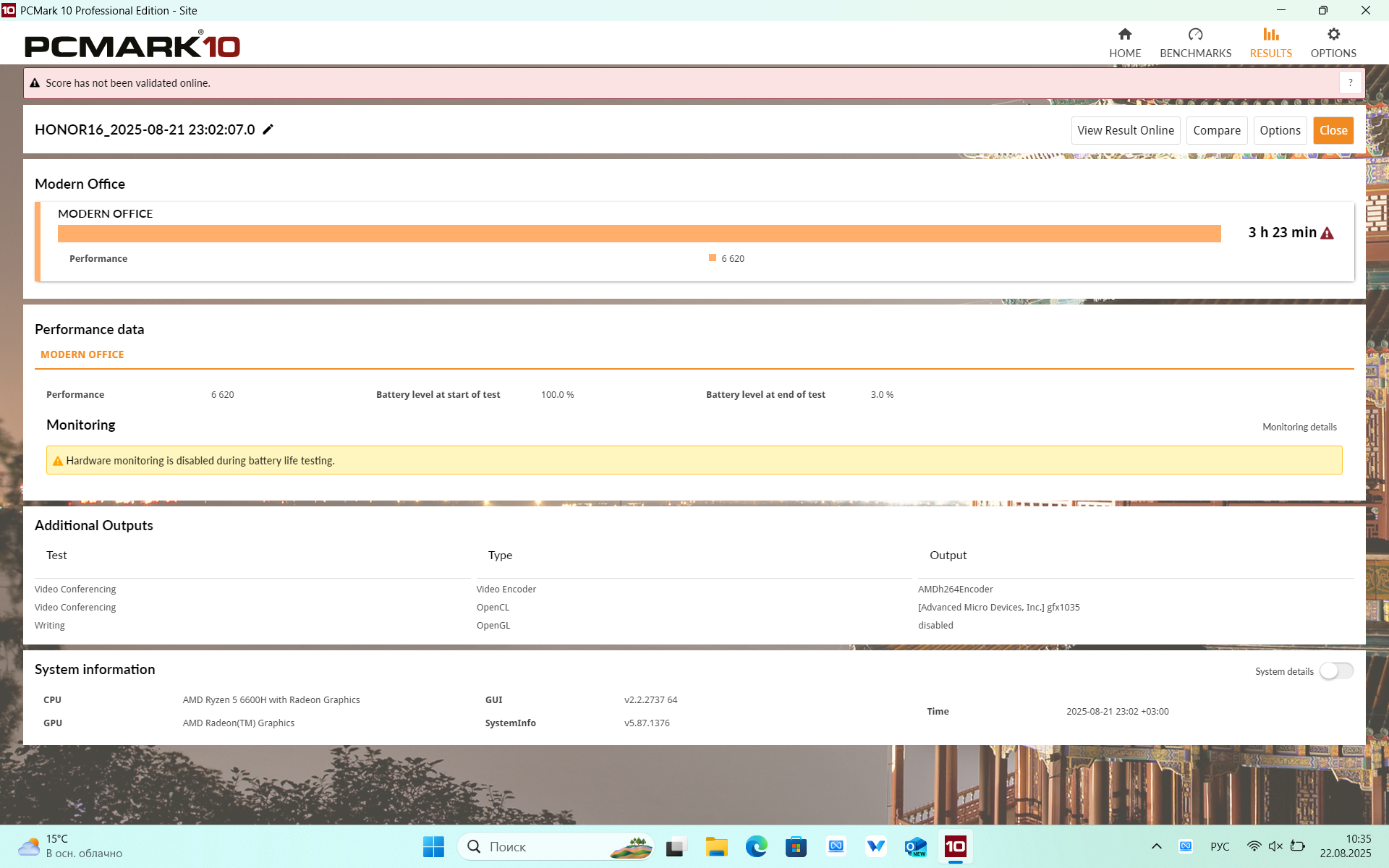HONOR MagicBook X16 AMD работает на процессоре AMD Ryzen 5 6600H c TDP 35–40 Вт («сбалансированная» производительность и максимальная). Для 16-дюймового ноутбука за 50 тысяч рублей это довольно приличная производительность, ближайшие конкуренты либо столь же «шустрые», либо уже не дотягивают.