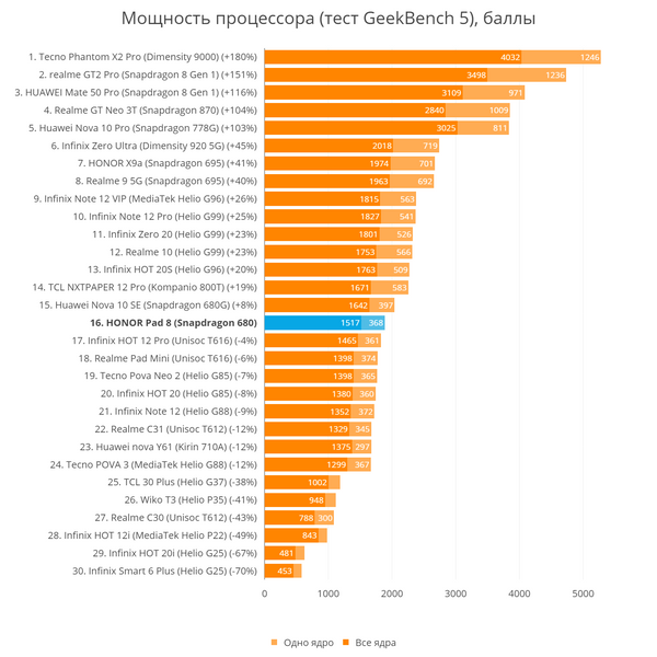 За вычислительные мощности в HONOR Pad 8 отвечает процессор Qualcomm Snapdragon 680. Если вы из тех, кто перед покупкой планшета «копает» общие рейтинги процессоров и сводные таблицы, вы уже видели, что: