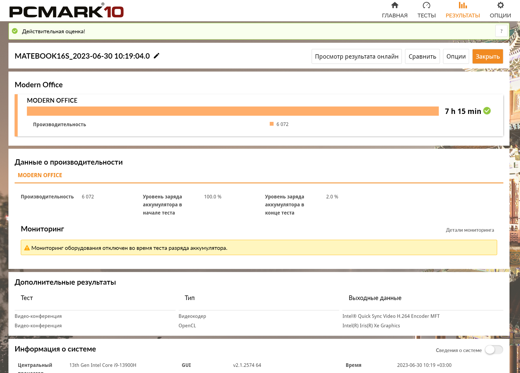 Но, даже с такими условиями ноут при тестировании в Microsoft Office, браузере и просмотре видео героически выдерживает чуть больше семи часов автономной работы в офисных программах. Видео получится смотреть чуть больше — почти 8 часов, а что касается игр, то без подключения к питанию MateBook 16s хватило на 2 часа и 7 минут неистового гейминга.