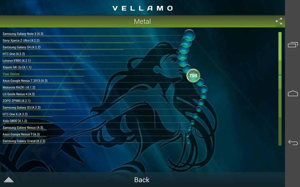 В тесте Vellamo Metal устройство набрало 704 очка. Это примерно соответствует результату Nexus 7. В тесте Vellamo HTML5 планшет показал более высокий результат: 1939 очков, поднимающие его почти до уровня Samsung Galaxy S4