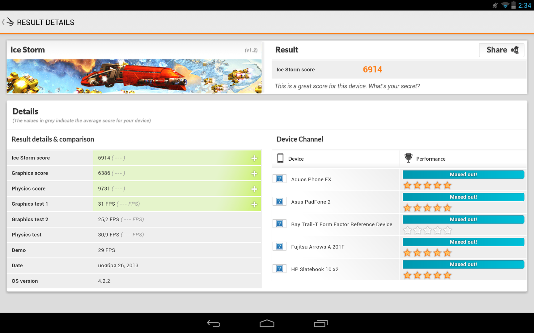 Аппаратная часть планшета на бумаге смотрится внушительно: два ядра процессора, восемь — видео, DDR3 в параметрах оперативной памяти и прочее-прочее. Действительно, устройство весьма шустрое: воспроизведение HD-видео и полновесные игры не смогут умерить пыл нашего «атомного» гостя, лаги интерфейса, работы и запуска приложений нам тоже не встретились. Бенчмарки, которые мы по обыкновению используем в своих обзорах, не всегда по достоинству могут оценить все скорости работы гаджета; тем не менее, в синтетических тестах планшет тоже показал себя хорошо.