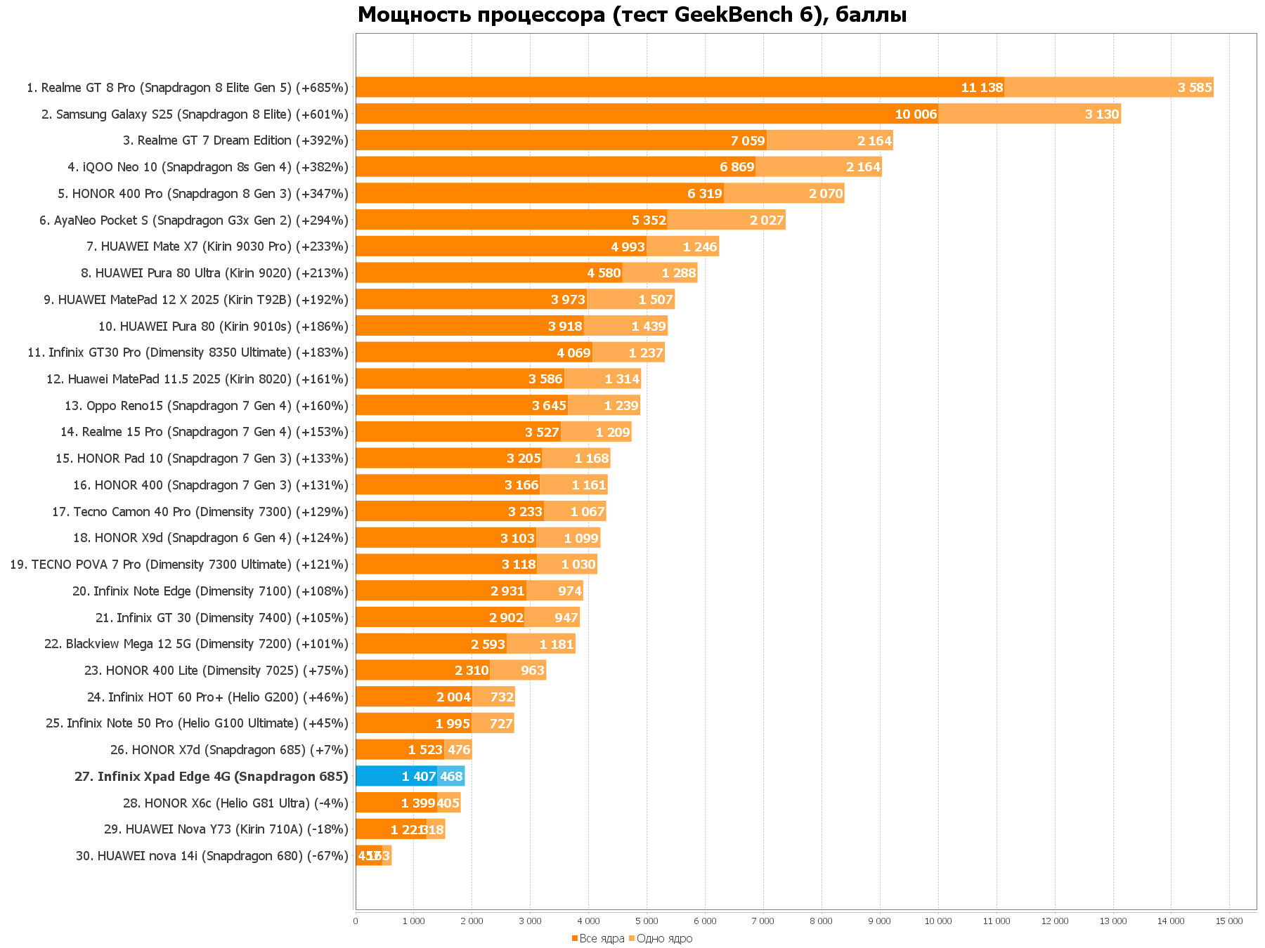 Внутри Xpad Edge установлен Qualcomm Snapdragon 685 — это почти трёхлетний и далеко не самый производительный процессор. Представляет он из себя восьмиядерный чип, построенный по техпроцессу 6 нм. Графика Adreno 610 GPU, которая точно не вывезет современные топ-игры или тяжелые программы для работы с графикой или видео. Вообще, единственная причина по которой он тут появился (помимо удешевления стоимости) — это энергоэффективность, чтобы ваш тонкий планшет с не самым мощным и совсем не горячим «камнем» мог максимально долго протянуть без подзарядки.