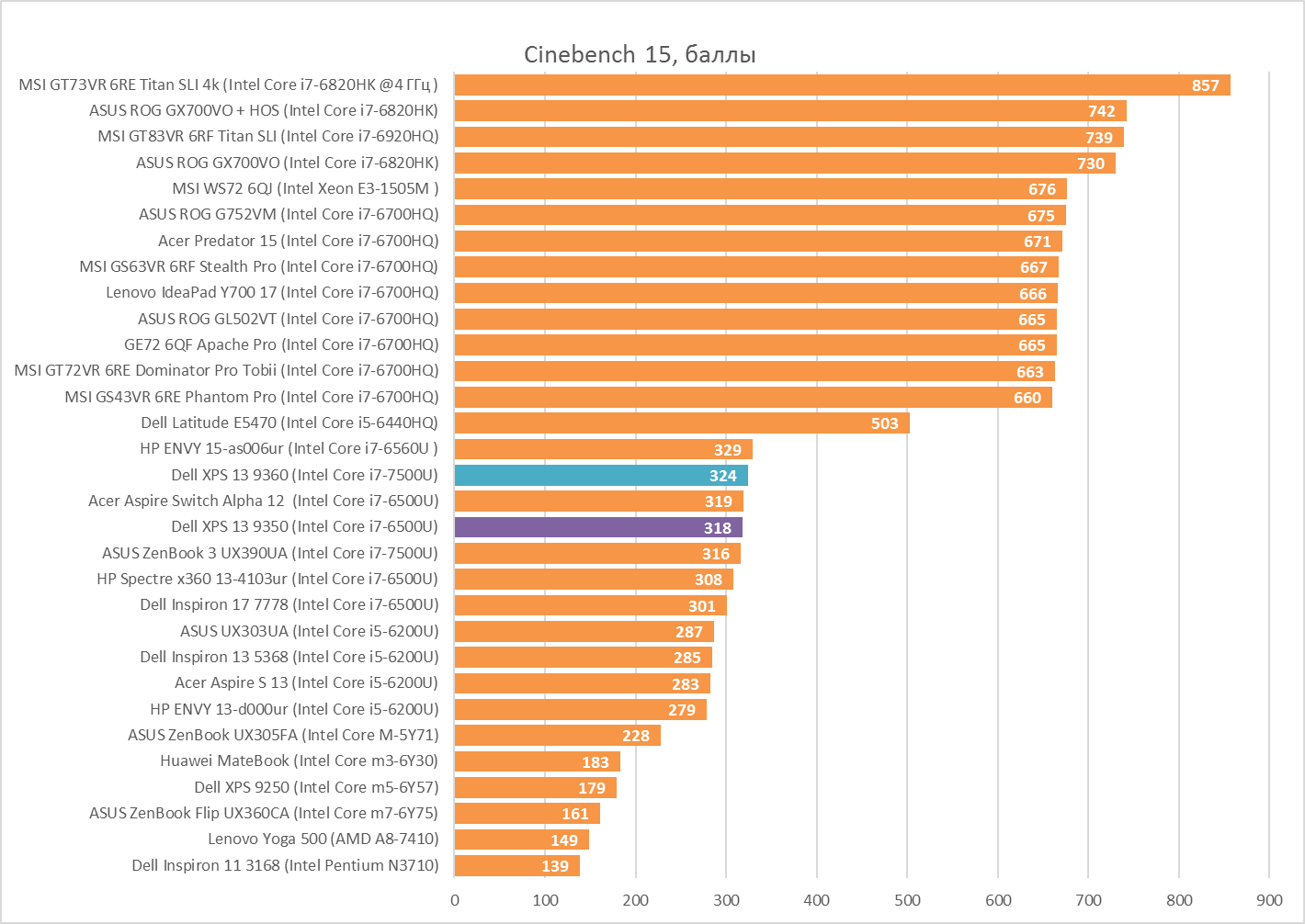 Даже в случае с настолько похожими лаптопами никогда не можешь быть уверен, что сравниваешь именно процессоры, а не всю систему целиком, поэтому предупреждаю о возможных погрешностях. Начнём, как обычно, с процессорных тестов. По их результатам можно твёрдо сказать, что i7-7500U быстрее любого побывавшего у нас i7-6500U. Но разница символическая. В Cinebench R15 она составляет 4,01% по сравнению со средним результатом всех протестированных у нас i7-6500U, а при кодировании видео в x264 HD Benchmark 4.0 уже 8,57%. i7-7500U хоть и имеет более высокие частоты, но толку от этого не так много, как хотелось бы.