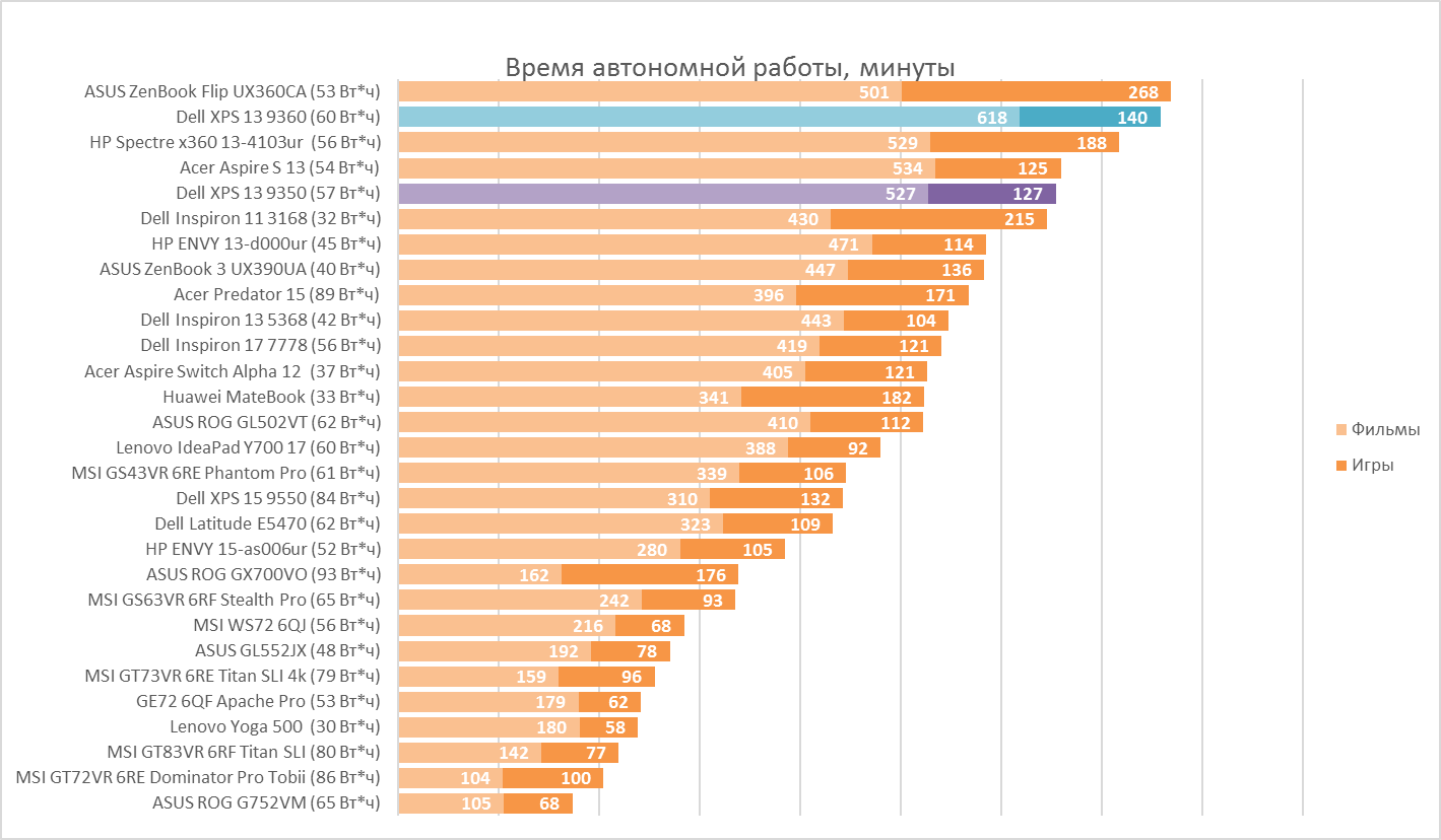 Слабая прибавка в производительности стала уже обычным делом для всех, кто следит за выходом новых чипов Intel. Компания давно переключила свои приоритеты на создание не только мощных, но и экономичных процессоров. Так что может быть новый Dell XPS 13 удивит нас временем автономной работы? Для тестирования я всегда выбираю яркость дисплея 160 кд/м2, включённый Wi-Fi и выключенную подсветку клавиатуры. В таких условиях новичок проработал при проигрывании HD-фильмов больше десяти часов, что является рекордом среди всех результатов протестированных нами в фильмах ноутбуков. В играх же результат обычный — два часа.