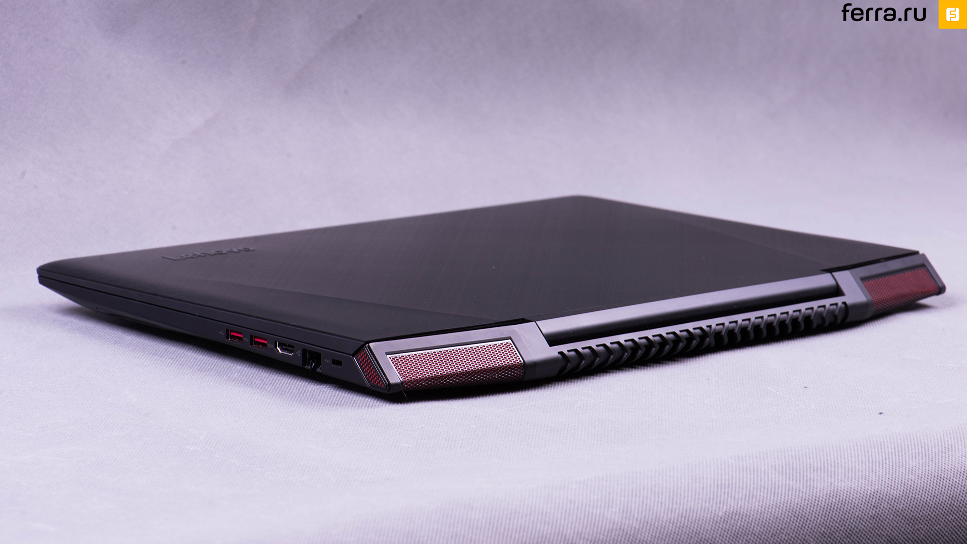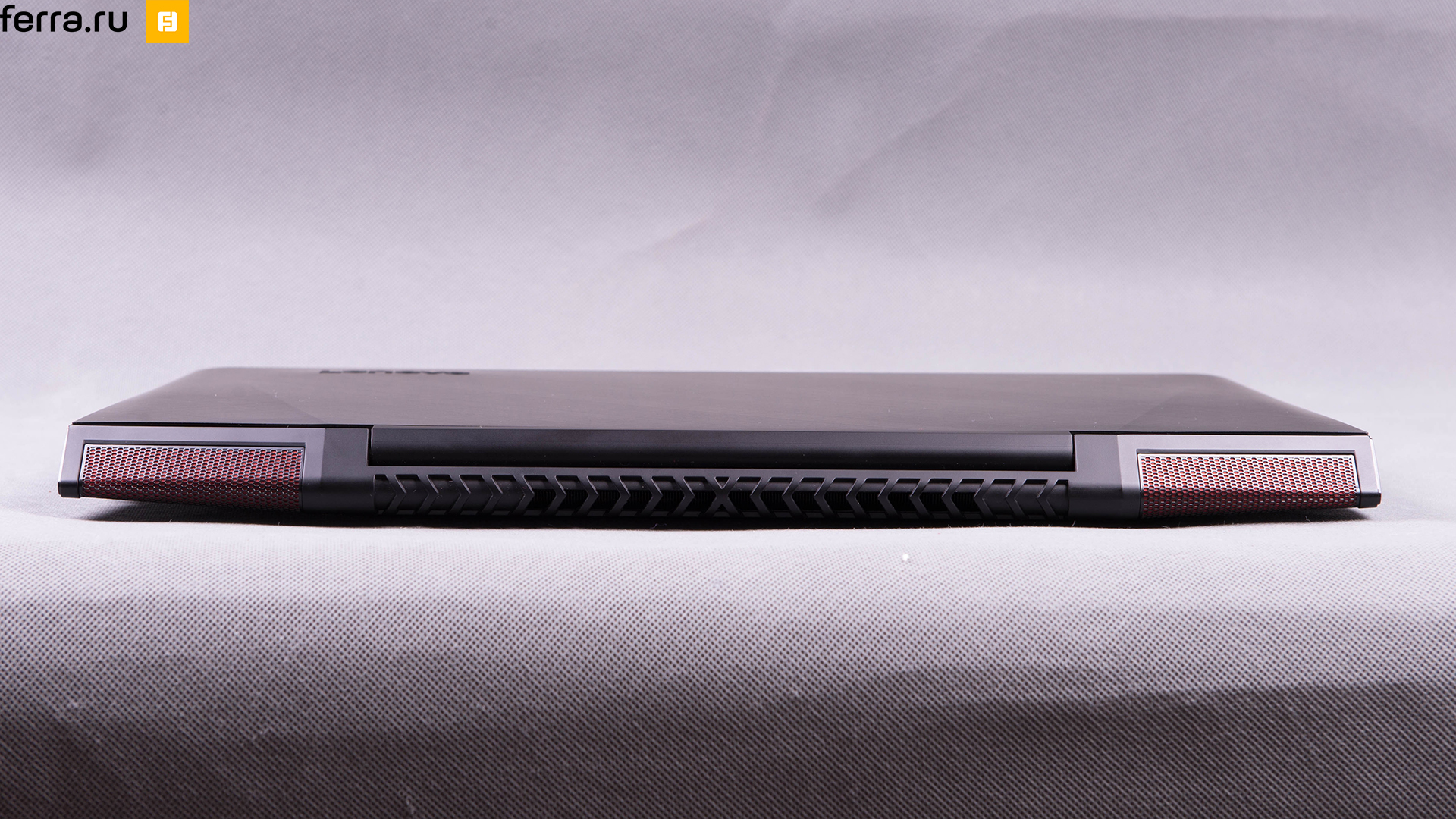 Lenovo пока что не решается поменять дизайн своего теперь уже не единственного геймерского ноутбука, поэтому он выглядит почти точно так же, как модель конца 2014 года. Когда он закрыт, его «агрессивность» видна только при взгляде на заднюю панель с красными вставками, проглядывающими через перфорированные чёрные металлические панели. Металлическая крышка имеет два едва заметных изгиба, менее выраженных, чем, например, у . Кроме них, на крышке присутствует интересный рисунок из пересекающихся линий шлифования.