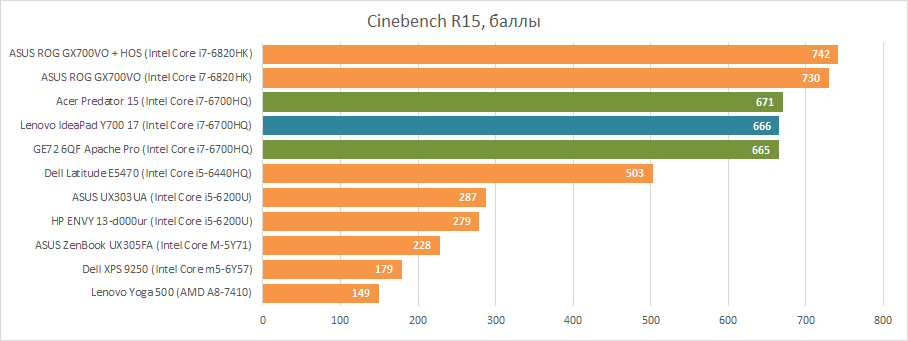 Модификаций Lenovo IdeaPad Y700 17 на нашем рынке весьма немного, что облегчает пользователю выбор. В качестве CPU может выступать только Intel Core i7-6700HQ — самый популярный мобильный процессор среди лэптопов, которые должны быть производительными не только на рекламных проспектах. Он обладает 45-ваттным теплопакетом, четырьмя ядрами с возможностью обрабатывать восемь потоков и тактовой частотой вплоть до 3500 ГГц. Не топовый, но один из самых мощных среди актуальных процессоров Intel (если не считать серверных моделей). В графиках я также выделил лэптопы с тем же самым CPU — результаты практически одинаковые.