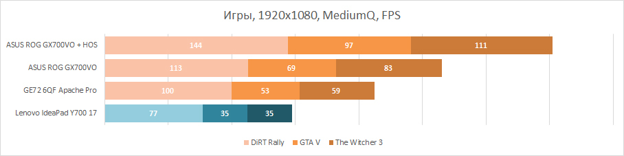 Несмотря на рекламу производителя и агрессивный внешний вид, Lenovo IdeaPad Y700 17 нельзя назвать по-настоящему игровым лэптопом. Ведь он оснащён только лишь NVIDIA GeForce GTX 960M — производительной, но далеко не лучшей видеокартой. В данном лэптопе у неё даже есть 4 ГБ видеопамяти GDDR5, но такой объём задействовать нечем — видеочип начинает пасовать значительно раньше. По сравнению с MSI GE72 6QF Apache Pro, который имеет на борту, помимо того же процессора и такого же количества оперативной памяти, графический адаптер NVIDIA GeForce GTX 970M с 3 ГБ GDDR5, герой этого обзора отстаёт в играх более чем в полтора раза и даже на средних настройках не спешит показать высокий FPS. Поэтому Lenovo IdeaPad Y700 17 я бы скорее назвал качественным мультимедийным ноутбуком, домашним медиакомбайном с возможностью поиграть в современные игры, но на средних настройках в лучшем случае.