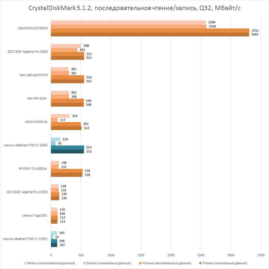 Система хранения данных заслуживает отдельного разговора. В нашем семпле она представляет собой тандем из жёсткого диска объёмом 1 ТБ и SSD на 128 ГБ. На последнем установлена система, по соседству поместятся разные программы и одна какая-нибудь современная игра. В целом, лэптоп будет работать быстро, чего не скажешь о загрузке игровых уровней. Это один компромисс. Второй — конфигурация только с одним накопителем, твердотельником на 512 Гбайт. Но у лэптопа два интерфейса подключения накопителей, а значит, со временем, немного подкопив, вы сможете докупить еще один накопитель. Что касается тех, что уже были в нашем семпле Lenovo IdeaPad Y700 17, то, как можно увидеть из диаграмм, они не самые лучшие: не только SSD, но и HDD умудряется проигрывать по скорости записи своим собратьям.
