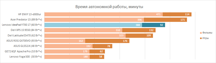 «Геймерский» лэптоп Lenovo удивил нас своей «ультрабучной» автономностью. Несмотря на большой экран, даже очень большой экран, лэптоп смог воспроизводить фильм в HD-качестве почти 6,5 часов, всего на полтора часа уступив чистокровному ультрабуку HP ENVY 13.