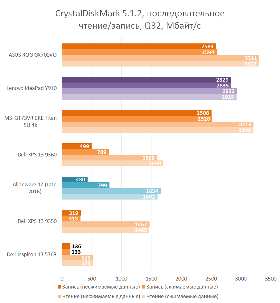 Напомню, что Lenovo IdeaPad Y910 достался нам в очень «богатой» конфигурации. Очень давно к нам не приезжал ноутбук, у которого в качестве системного накопителя стоит SSD сразу на 1024 ГБ. 1024! SSD! Если быть точным, то два по 512 ГБ, объединённых в RAID0. Скорость работы у них очень высокая, особенно при работе с последовательно расположенными данными. Alienware 17 тоже хорошо справляется с чтением и записью данных на SSD, но всё же его накопитель на 256 ГБ заметно медленнее.