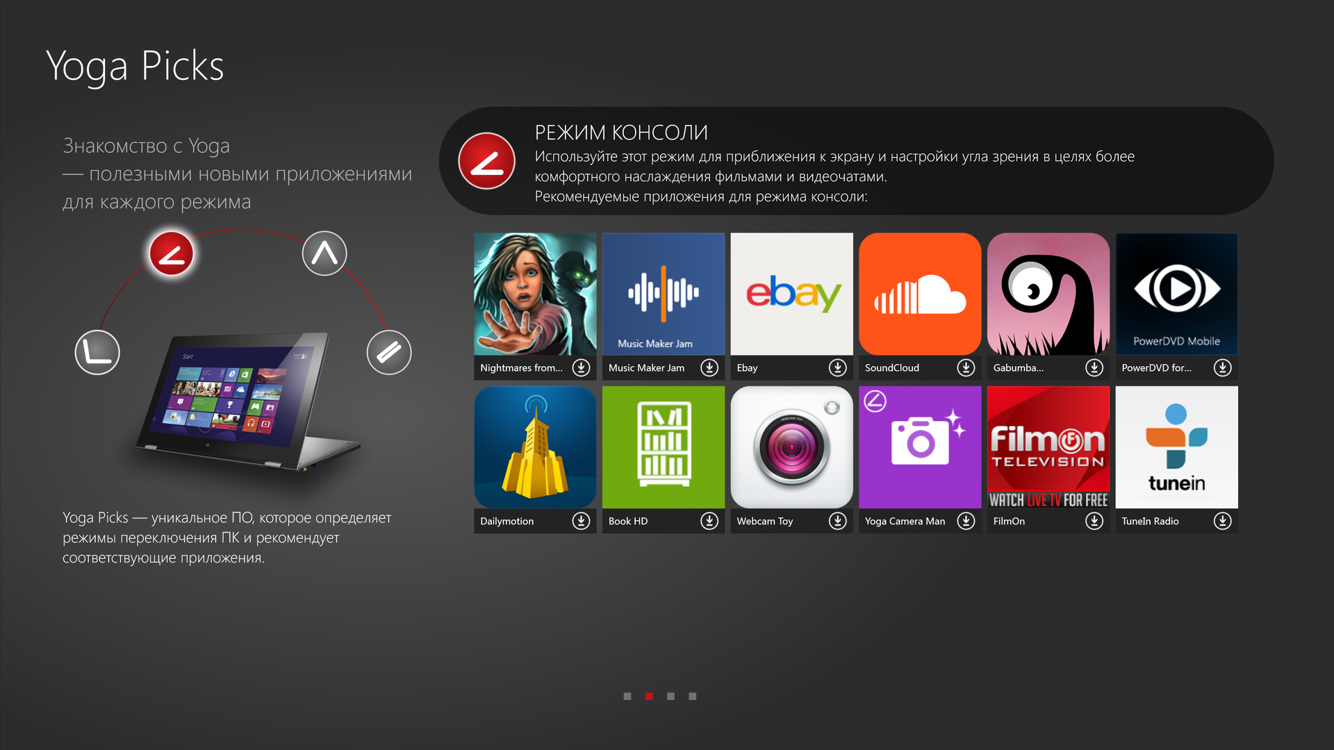 Вопреки пафосной презентации приложения Yoga Picks, его алгоритмы оставляют желать лучшего — логика подбора ПО прослеживается с трудом, а постоянность в рекомендациях навевает тоску. Кстати, даже сами Lenovo не определились с названием промежуточного режима — в одних документах он фигурирует как «режим тента», в других — как режим «презентации».