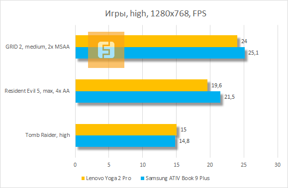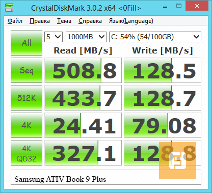 А вот и различия — семпл Samsung ATIV Book 9 Plus, побывавшего у нас в редакции, обладает отнюдь не лучшим твердотельным накопителем. Как SSD он демонстрирует себя лучше всего в последовательном чтении, а вот при линейной записи едва ли отличается своей «быстротой» от жёсткого диска. У Lenovo IdeaPad Yoga 2 Pro же в этом плане всё отлично, никаких нареканий к работе твердотельного накопителя не возникает.