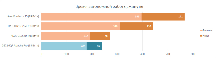 А вот ко времени автономной работы есть претензии. Причём, в первую очередь можно подумать, что проблема в небольшом по ёмкости аккумуляторе. Однако, если посмотреть, сколько минут любой из протестированных ранее лэптопов может «прожить», затратив 1 Вт*ч батареи, то не трудно понять, что GE72 6QF Apache Pro просто не очень оптимизированно тратит энергию. Но, на мой взгляд, автономность для 17,3-дюймового геймерского ноутбука — дело десятое.