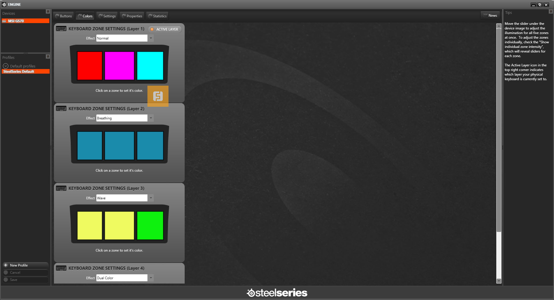 Клавиатура, как это положено большинству геймерским ноутбучным клавиатурам MSI, наделена подсветкой с изменяемой цветовой гаммой. GS70 Stealth Pro поддерживает SteelSeries ENGINE и теперь пользователь может настраивать до четырёх различных раскладок клавиатуры с возможностью установки макросов на отдельные клавиши и регулируемой подсветкой цветовых сегментов для каждой раскладки.