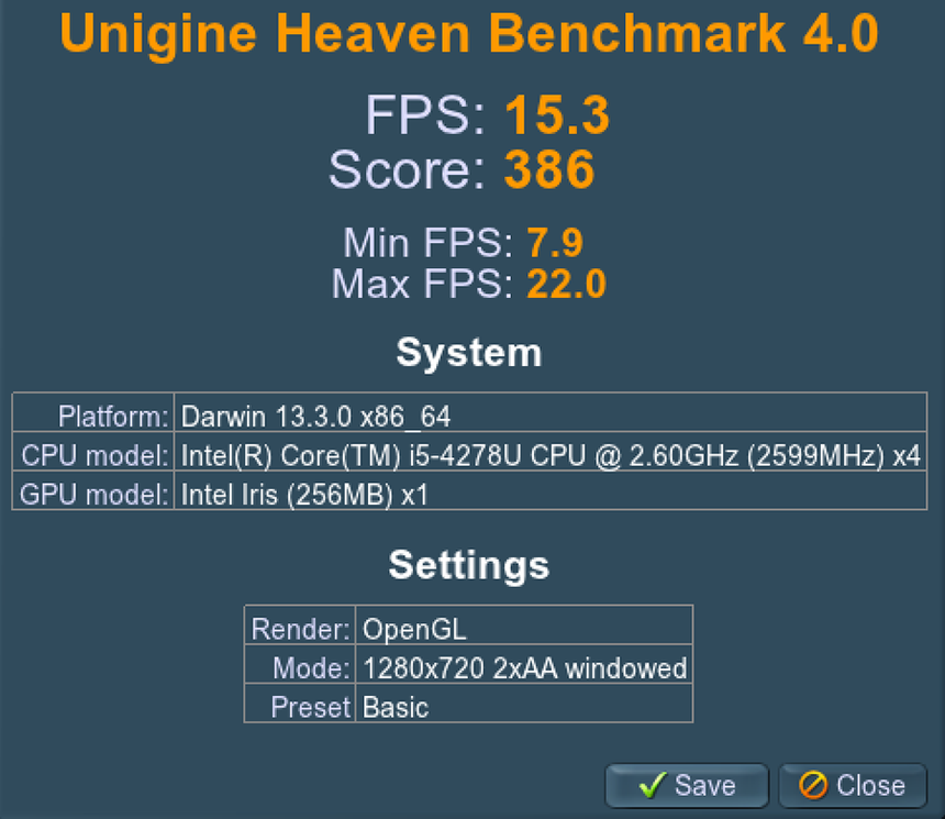 Apple давно убеждает нас в том, что MacBook Pro — это не только рабочая станция, но и вполне себе игровой ноутбук. И в самом деле, игр для Mac становится все больше, однако мы бы не стали рекомендовать Mac в целом и MacBook Pro с Retina-дисплеем в частности любителям игр. Для этого есть более производительные решения. Ну а для иллюстрации того, что играть на MacBook Pro в целом можно, мы провели тестирование с помощью Unigine Heaven. Результаты вы можете видеть выше.