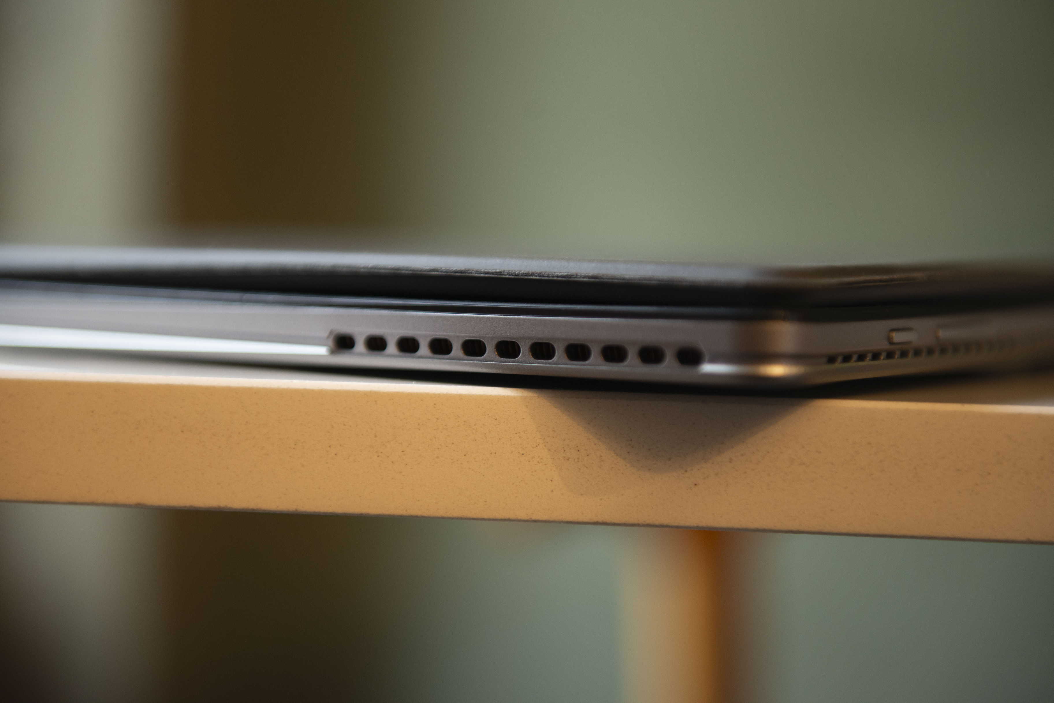 На левой грани разместились классические «планшетные» клавиши: качелька регулировки громкости и кнопка разблокировки и включения девайса. Про вентиляцию тут тоже не забыли и впихнули вспомогательные отверстия для воздуха (и динамиков, их тут четыре) на три из четырёх сторон.