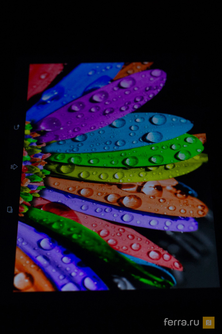 Разрешение экрана составляет 1920х1200 точек, а плотность изображения — 283 ppi. Экран очень яркий и отлично читается даже в самый яркий и солнечный день. Этому способствует и высокая даже по меркам IPS контрастность. Дисплей выполнен на одном слое стекла без воздушных прослоек, что существенно снижает бликование. Углы обзоров очень хорошие — 178 градусов по вертикали и по горизонтали. При взгляде под острым углом цвета не инвертируются, лишь немного снижается яркость.