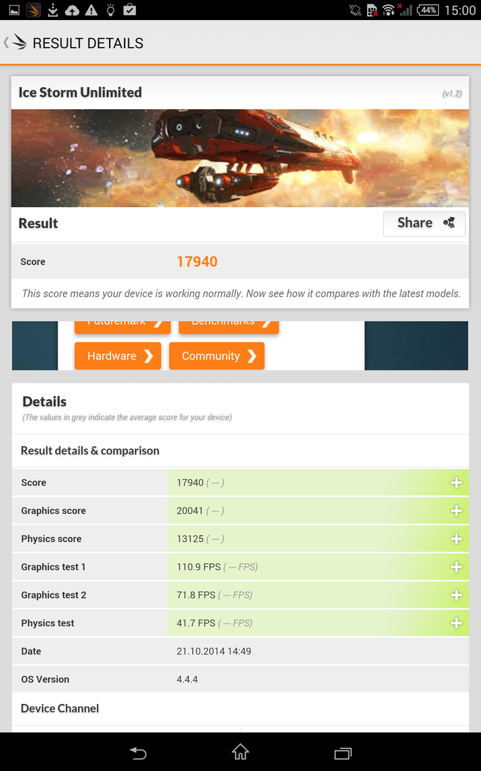 Результаты тестирования Sony Xperia Z3 Tablet Compact в AnTuTu 3D Rating (OpenGL ES 2.0)