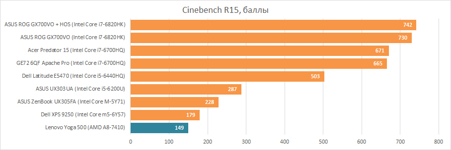 Что касается AMD A8-7410, то здесь никаких сюрпризов. Производительность в целочисленных вычислениях сопоставима с не самыми мощными Intel Core m, а ведь AMD A8-7410 — старший представитель Carrizo-L. Значит, остальные решения рассчитаны на еще более терпеливых пользователей. Возможно, конечно, что в Lenovo Yoga 500 ограничен теплопакет AMD A8-7410, и однажды найдётся ноутбук, в котором потенциал этого чипа раскрыт лучше. Но сейчас мы имеем то, что имеем. Отдельно стоит упомянуть, что память стандарта DDR3 присутствует на рынке уже так много лет, а AMD до сих пор предлагает нам процессоры, которые не могут задействовать весь её потенциал. Наконец, процессор хорошо себя заявил в плане энергопотребления, но, чтобы сделать более полные выводы, нам необходимо собрать больше результатов различных лэптопов. А за это время, возможно, через наши руки пройдут ноутбуки и с другими представителями AMD Carrizo и Carrizo-L, и мы узнаем их с новой, надеюсь, позитивной стороны.