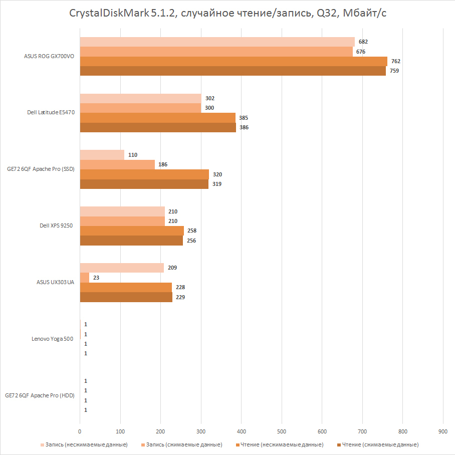 В качестве системы хранения данных пользователь получает стандартный жёсткий диск, 1 штука. На фоне современных SSD его скорость чтения/записи, как видно из диаграмм, проигрывают очень сильно. Однако для 2.5-дюймового диска он показывает совершенно нормальные ожидаемые результаты. Конечно, с твердотельным накопителем жизнь пользователя Lenovo Yoga 500 заиграла бы новыми красками, но только, если бы вам хватило бы какого-нибудь скромного SSD на 128 Гбайт.