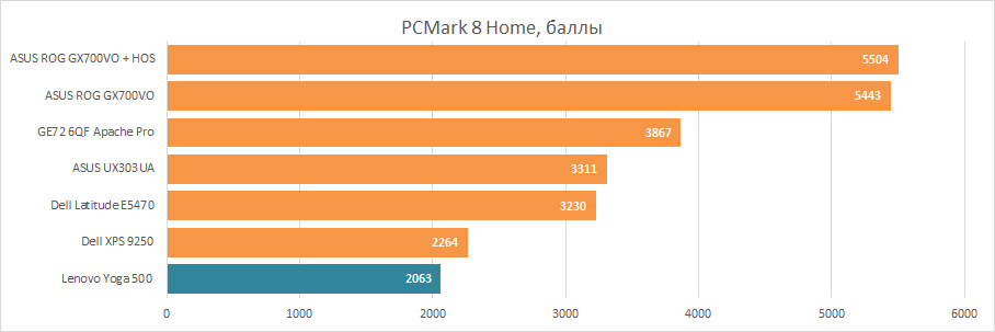 Нечем Lenovo Yoga 500 удивить нас даже в тесте на скорость работе в браузере. И общая оценка системы, по версии PCMark 8 Home, тоже оставляет желать лучшего.