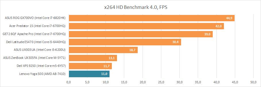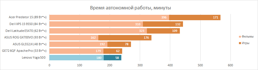 В тесте автономной работы процессор AMD A8-7410 показал себя наилучшим образом, а вот ноутбук Lenovo Yoga 500 — нет. Другими словами, производитель лэптопа оснастил его очень маленьким по ёмкости аккумулятором, всего 30 Вт*ч. Поэтому, хоть на каждый Вт*ч ноутбук способен «крутить» HD-фильм целых шесть минут, но проку от этого мало. Три часа работы для устройства с экономичным процессором, да еще трансформера, это весьма постыдный результат. Но виноват здесь не AMD A8-7410, а маленькая батарея.