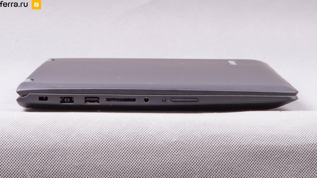 От планшетов Lenovo Yoga 500 достался дисплей-зеркало, зато от ноутбуков — большое количество портов. Правая грань даже имеет разъём RJ-45 и полноценный HDMI, не говоря уже о двух USB 3.0. Здесь же поместилась маленькая элегантная кнопка включения со встроенным светодиодом, который меняет цвет в зависимости от того, идёт ли в данный момент зарядка. На противоположной грани находится кард-ридер, качель громкости, кнопка блокировки автоповорота изображения, раритетный порт USB 2.0 и такой же по форме, но иной по содержанию — разъём для подключения зарядного устройства.