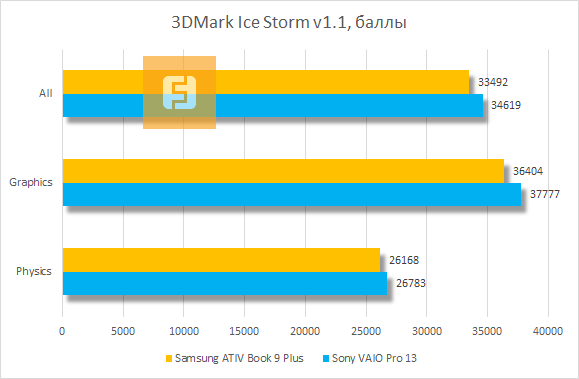 В тестировании производительности Samsung ATIV Book 9 Plus NP940X3G также принял участие ультрабук Sony VAIO Pro 13. В нем используется Core i7-4500U, объем оперативной памяти составляет 8 Гбайт, ёмкость SSD — 128 Гбайт.