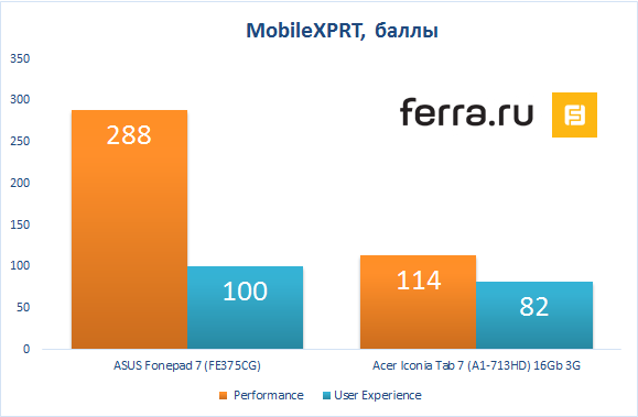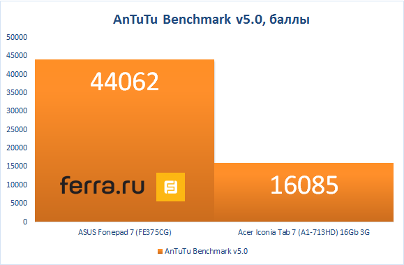 Обратимся к бенчмаркам. Я собрал результаты ASUS Fonepad 7 (FE375CG) в графики, сравних их с результатами Acer Iconia Tab 7 (A1-713HD) — 7-дюймовым планшетом за 7 тысяч рублей. Подробнее вы можете узнать о нём в нашем обзоре.