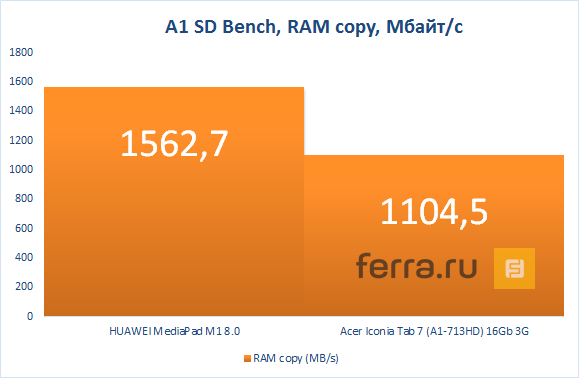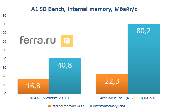Но вот памяти у него не очень много: постоянной всего 8 Гбайт, а оперативной только 1 Гбайт, так что нехватка свободного пространства будет повседневность владельца MediaPad M1 8.0. К тому же основная память ещё и работает довольно медленно, как видно из результатов бенчмарка A1 SD Bench.
