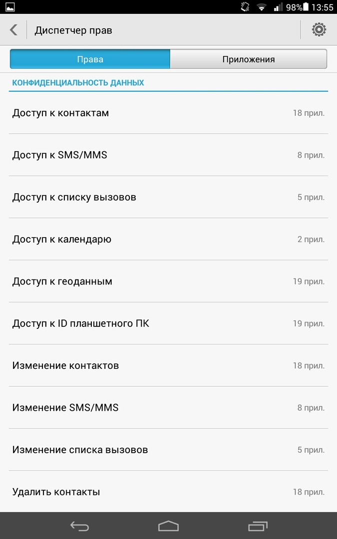 Радует большая гибкость настроек. Например, всем нам приходится при установке нового приложения соглашаться с целым списком того, куда это приложение может засунуть свой «нос». В HUAWEI MediaPad M1 8.0 вы можете уже после установки программы настроить ей любые права, причём планшет вас сам спросит, что «новичку» можно, а что нельзя. Если вы человек доверчивый, то можно разрешить всё нажатием на одну единственную кнопку. Настройка происходит в специальном Диспетчере прав. В целом — отличная функция, учитывая, что даже калькулятор порой не хочет устанавливаться без доступа к контактам, сети и многому другому.