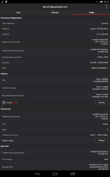 Lenovo TAB S8-50LC хорош не только внешним видом и качеством дисплея, но и «железом». В качестве системы-на-кристалле был выбран продукт от Intel, а именно четырёхъядерный Intel Atom Z3745 с тактовой частотой до 1,86 МГц и графикой Intel HD Graphics (311-778 МГц). Собственной памяти у героя этого обзора 16 Гбайт, из которых пользователю доступно примерно 11. К тому же можно воспользоваться microSD карточкой ёмкостью вплоть до 64 Гбайт. Оперативной памяти так вообще вдоволь — 2 Гбайт.