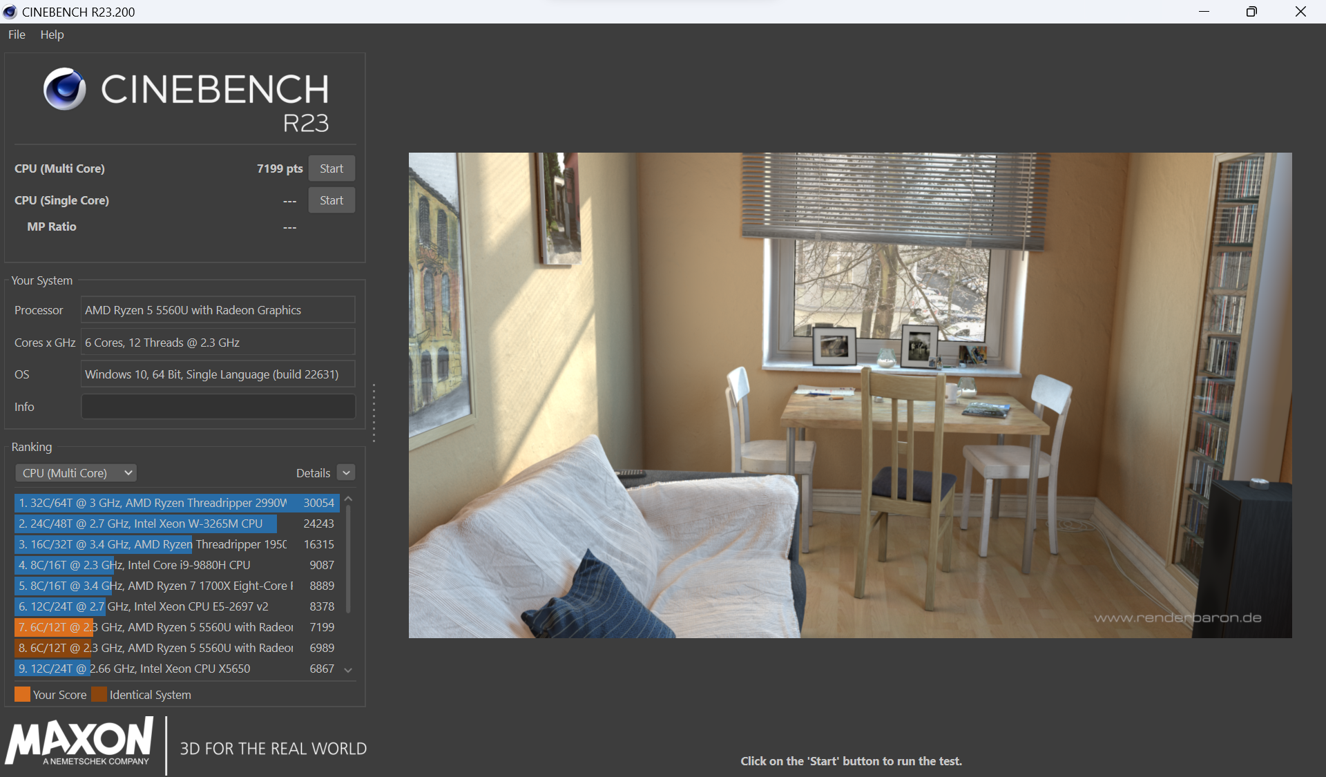 В общем, Ryzen 5 5560U, хоть и вышел ещё в 2021 г., всё ещё хороший процессор. На момент выхода был очень крут и со своими 6 мощными ядрами на равных соревновался с Intel Core i7-10710U и был быстрее чем Core i5-10400H из игровых ноутбуков. Да и сейчас он по быстродействию хорош — между Intel Core i5-1260U и i5-1240U. Примерно на 25-30% быстрее, чем Core i3-1215U и 1315U, которые продаются по такой же цене и вместо 6 мощных ядер предлагают 2 очень мощных + 4 маломощных.
