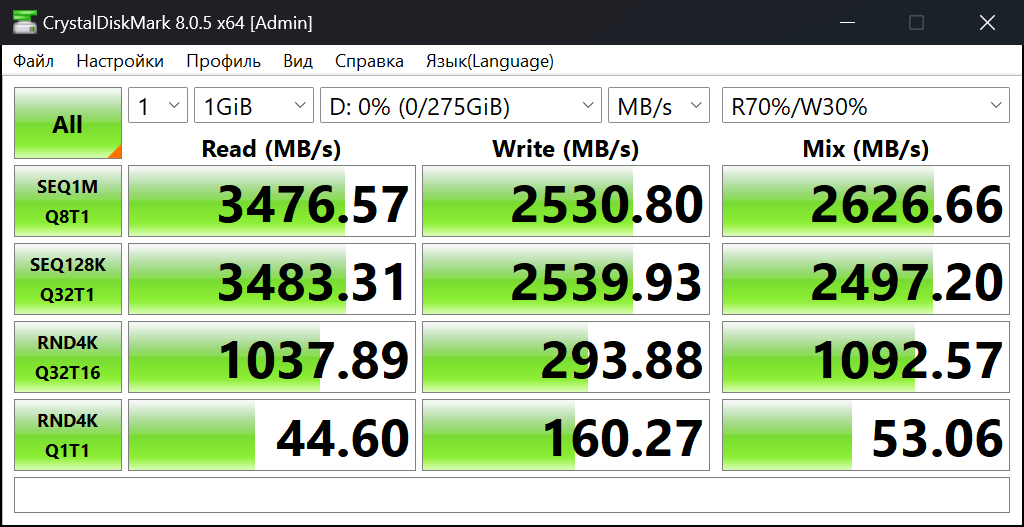 SSD — Phison E15T, типичный безбуферник PCIe 3.0 с быстродействием уровня «под пиво сойдёт». Если оставлять ему 10% свободного пространства и не записывать одним махом свыше 150 ГБ подряд — будет «дышать свободно» и по скорости вы не отличите его от более дорогих SSD.
